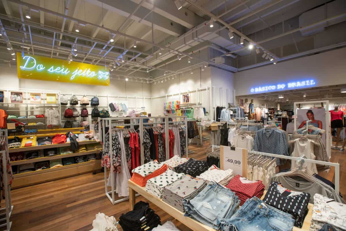 A marca apresenta os itens de moda femininos e masculinos na entrada da loja e, na parte central, inclui as camisetas básicas e o quiosque Hering POP, com peças exclusivas.